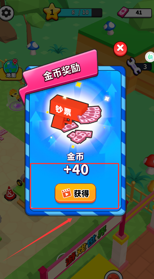 3、然后,关注金币奖励部分,画面上列出了“金币奖励、钞票、金币”以及“+40 获得”。
