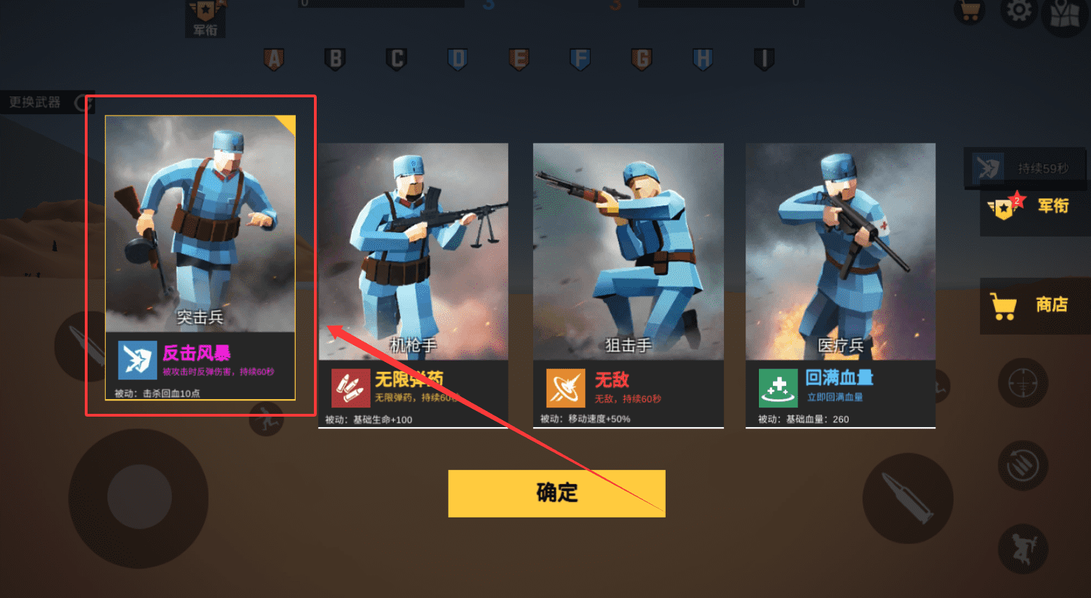 4、战斗过程中记得随时留意技能状态与血量,医疗兵的回血技能可随时使用,而突击兵的反击风暴需要在受击时主动触发。