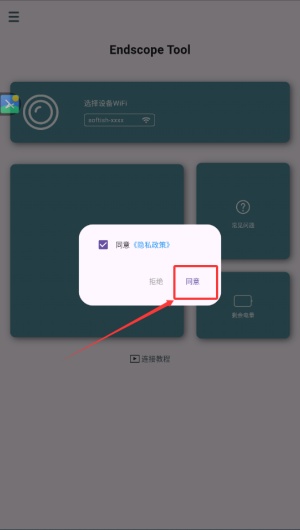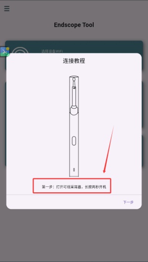 3.WiFi连接成功后蓝色指示灯长亮,然后打开EndscopeTool的APP上电量图标会显示电量格数,表示本产品与手机成功连接。