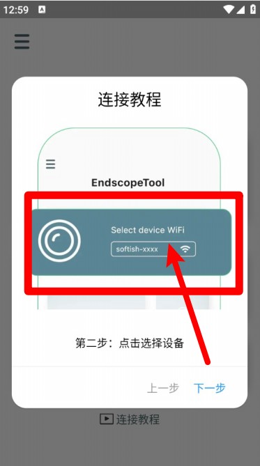 3、返回应用内,点击“选择设备”功能,从列表中找到对应设备并连接。