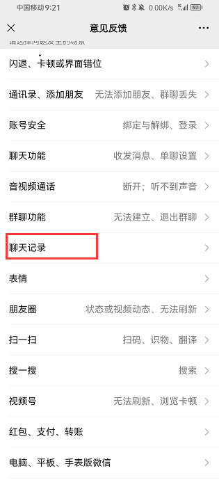 3、点击下方的“意见反馈”,“聊天”也可以点进去了解一些聊天记录的处理方法