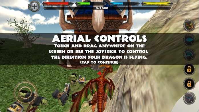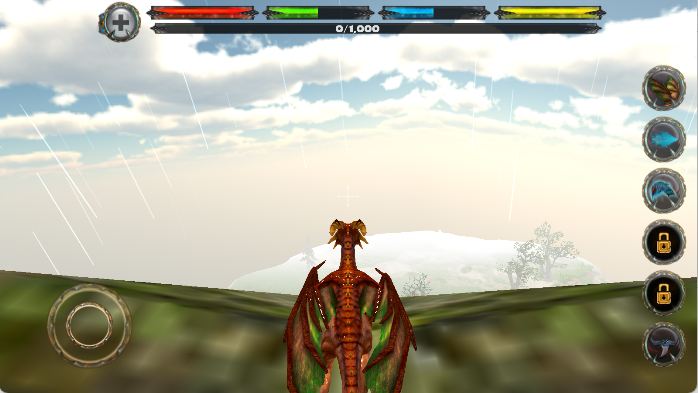 2、进入游戏后,通过虚拟摇杆控制巨龙移动,点击飞行按钮展开翅膀进行空中移动。