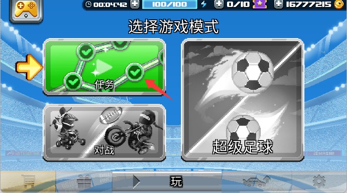 3、进入界面后在主菜单点击“选择模式”按钮,浏览竞速、足球、特技等不同玩法分类。