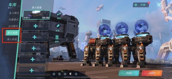 在试炼场地图中与最多六名工程师自由改装战车,负载限制为200(模块限制取决于战车所在车库,默认为多人创造,可使用隐形魔方)。