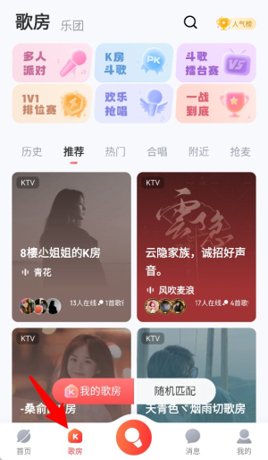 2、点击“歌房”进入K歌模式,支持多人派对与随机匹配。
