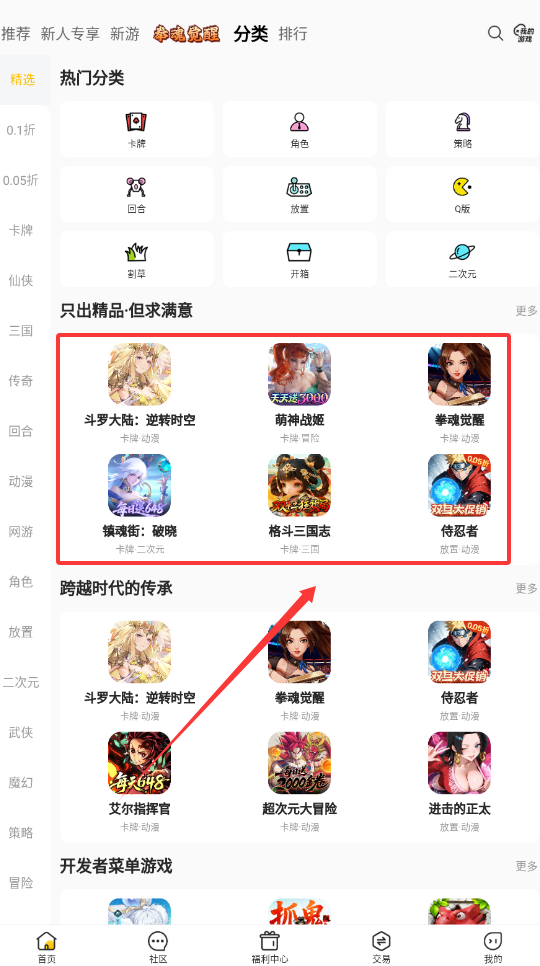 2、如果想找特定类型的游戏,可以点进“分类”页面。这里把游戏分得很细,像卡牌、角色、放置、二次元等。