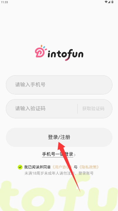 2、在登录界面输入手机号码和验证码,勾选同意相关协议后点击登录/注册进入。