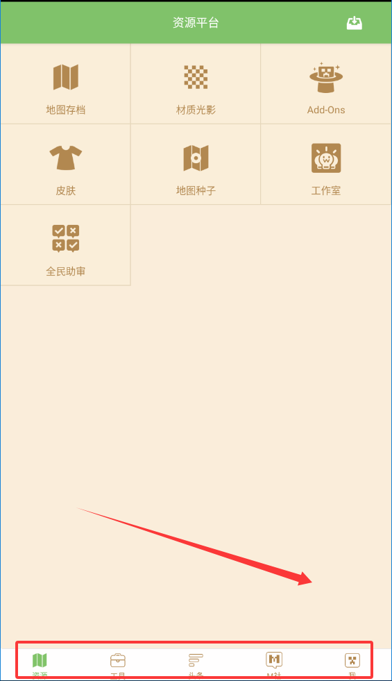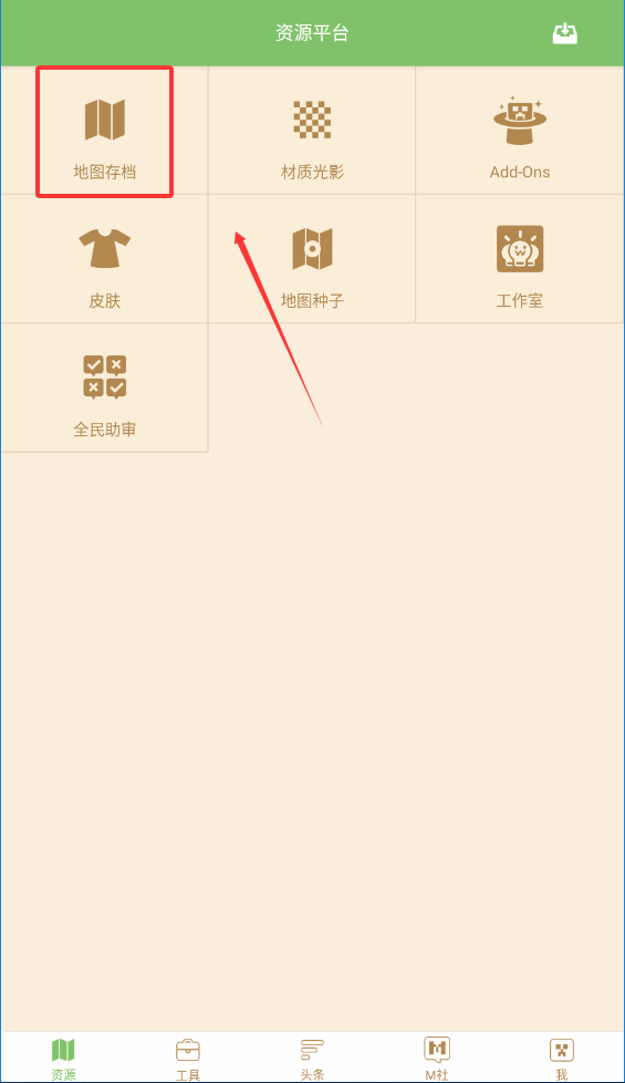 1 、打开软件首先见到的是清爽直观的界面,顶部绿色横幅点明应用属性,下部功能区整齐陈列着地图存档、材质光影等选项,每个板块均配有显眼图标与文字说明,引导明确。