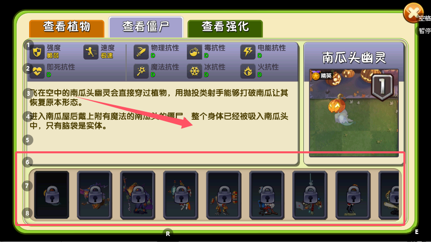 4、无论查看僵尸还是强化道具,界面布局都遵循左侧列表选择、右侧详细展示的原则。已收集的项目可自由查看,未收集的则会呈现锁定状态,鼓励探索以完成收集。