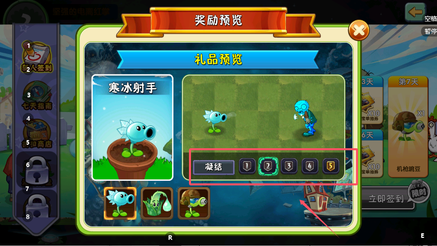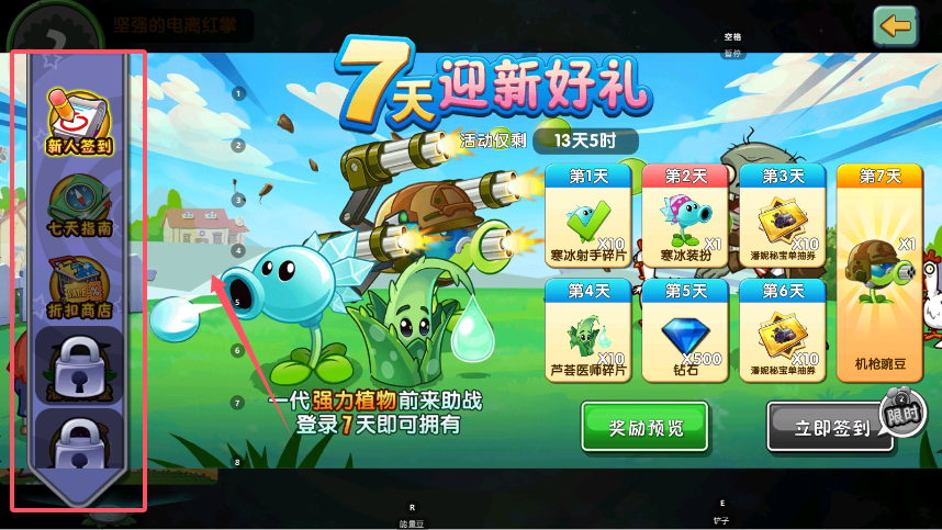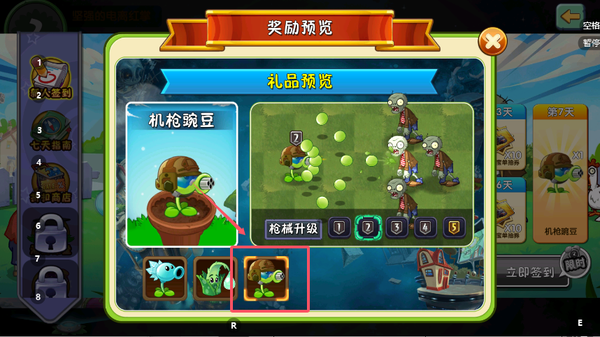3、界面右侧的奖励列表中,会明确标注不同签到天数对应的具体奖励,例如第3天可能获得金券,而连续签到第7天则可解锁“机枪豌豆”等特殊植物。