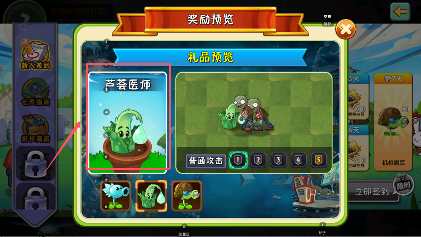 2、预览页面的中心区域会重点展示签到可获得的特殊植物,例如“芦荟医师”,并附有其基本属性信息。部分界面还会在植物形象旁标注“普通攻击”等属性数值供参考。