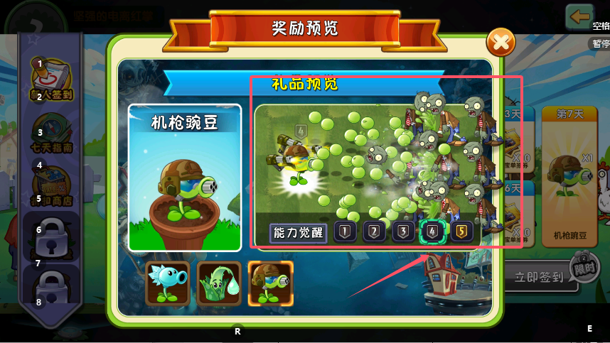 4、从活动开始日起,每日登录游戏并进入该页面点击签到,即可逐日解锁对应奖励。连续签到达到第7天时,便能获得“机枪豌豆”等稀有植物,这些植物在实战中能发挥重要作用。