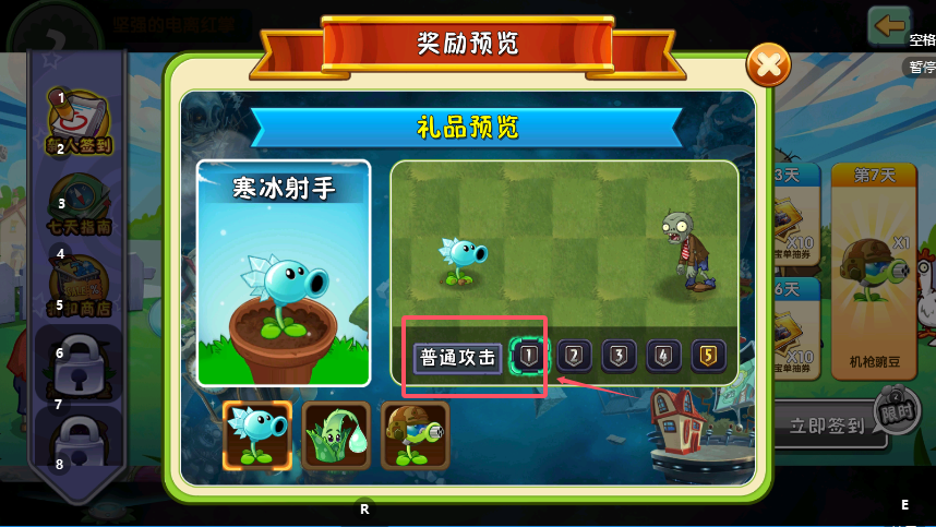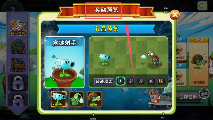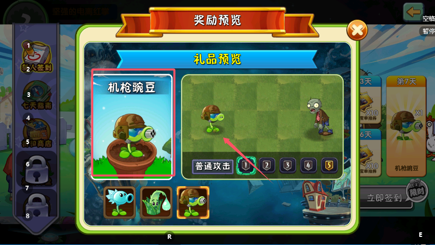 4、查看完奖励内容后,只需点击对应日期的“立即签到”按钮,即可完成当日签到并领取奖励。坚持签到满7天后,便能解锁“机枪豌豆”等特殊植物,为后续的游戏进程提供帮助。