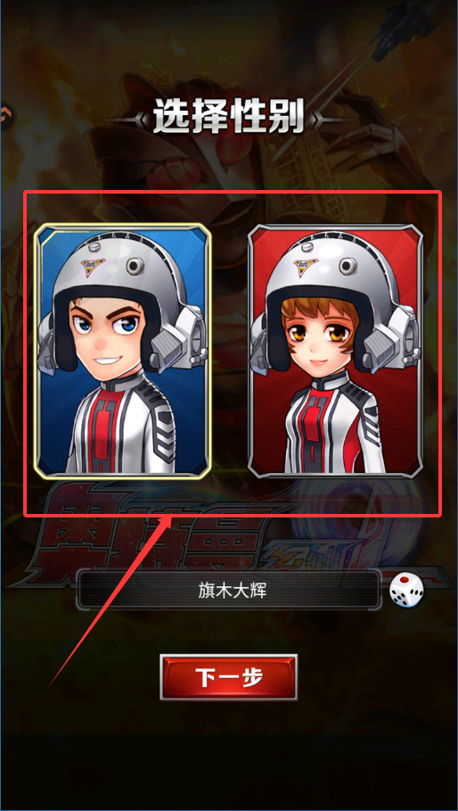 2、创建角色时,在“选择性别”界面挑一个你喜欢的形象,左边是男性右边是女性。角色名默认是“旗木大辉”,点名字旁的小骰子可以随机换名,之后点“下一步”确认。