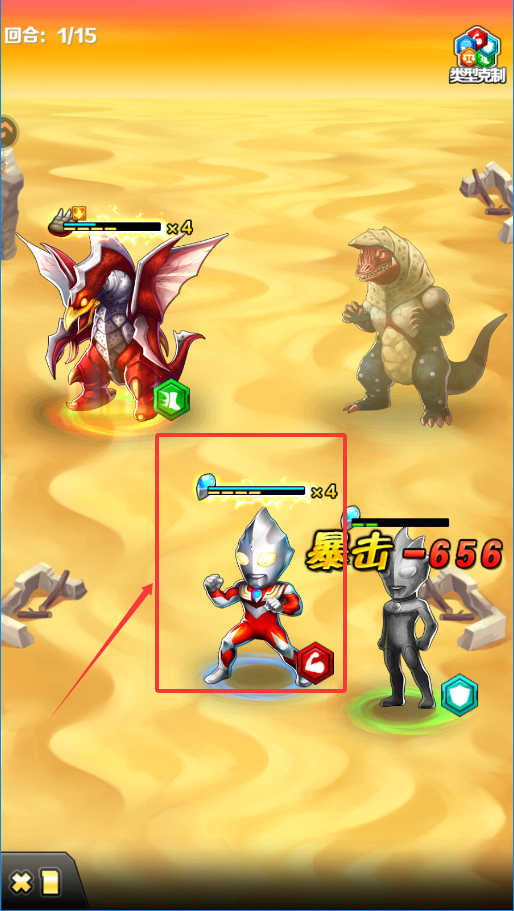 4、实际对战时,策略很重要。你要留意屏幕上的战斗信息,比如第四张图里显示的“暴击”和“类型克制”。根据对手的属性和技能,选择克制的奥特曼上场。