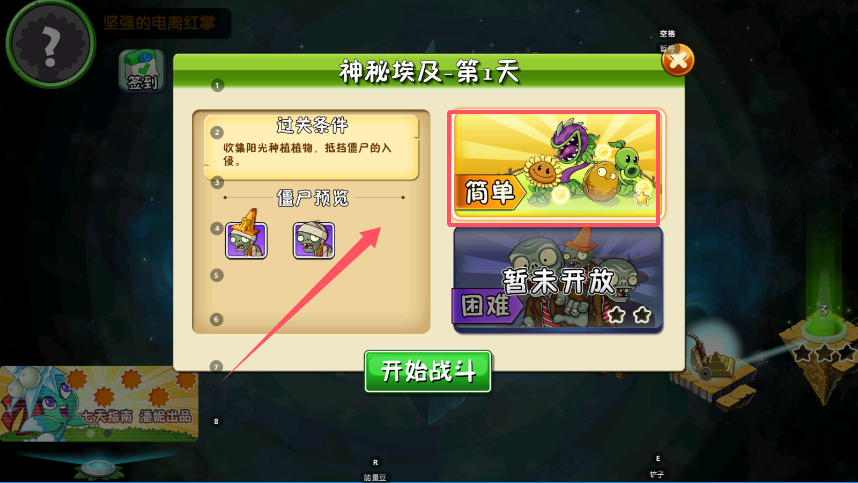 2、进入任意关卡后,界面顶部会清晰标注具体关卡名称与过关条件,左侧显示僵尸种类预览。右侧区域设有难度选择按钮,其中“简单”模式默认开放,适合初次体验。