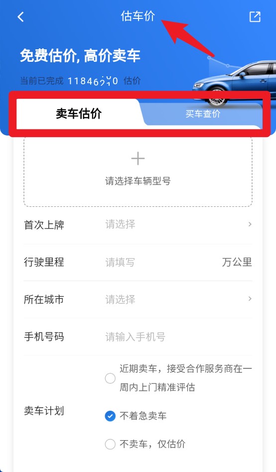 3、进入“卖车”页面填写手机号即可估价,流程简洁,最快当天可上门服务。