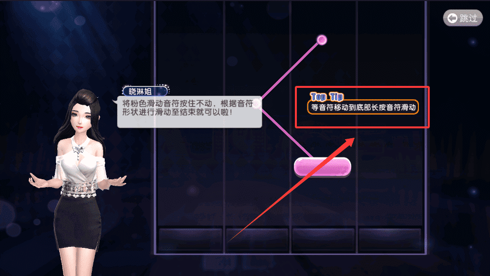 2、然后跟着屏幕上音符显示的弯弯扭扭的形状一路滑动过去,直到动作结束为止,这个操作熟悉几次就会很顺手了。