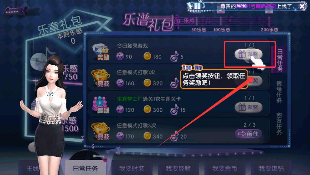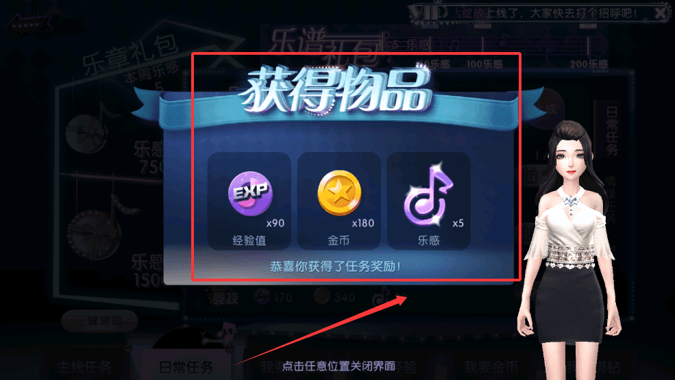 3、这些任务会定向奖励你需要的道具,跟着任务指引打歌5次或完成竞技目标,就能拿到较多经验与金币。