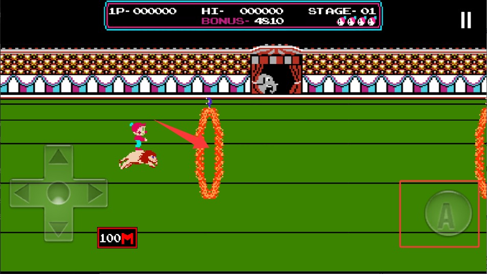跳火圈:游戏的第一关没什么难度,要注意把握住跳跃尺度,尤其是火圈和下面的火重叠起来才可以跳跃,控制一下距离即可。
