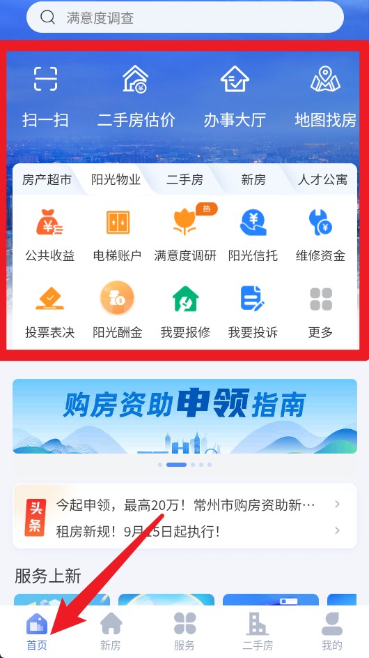 1、点击首页可快速进入扫一扫、估价、办事大厅、地图找房等常用入口,服务项目分类清晰易找。
