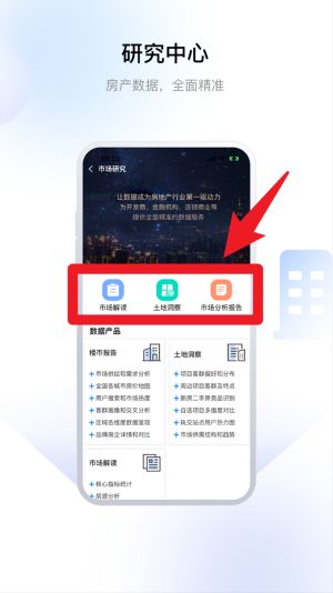 3、进入“研究中心”模块,可阅读市场解读、土地洞察与数据报告,帮助掌握常州房产市场的整体走势。