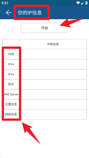 3. 在「你的IP信息」功能中,点击开始后可查看本机公网/内网 IPv4、IPv6 地址及 DNS 配置信息。