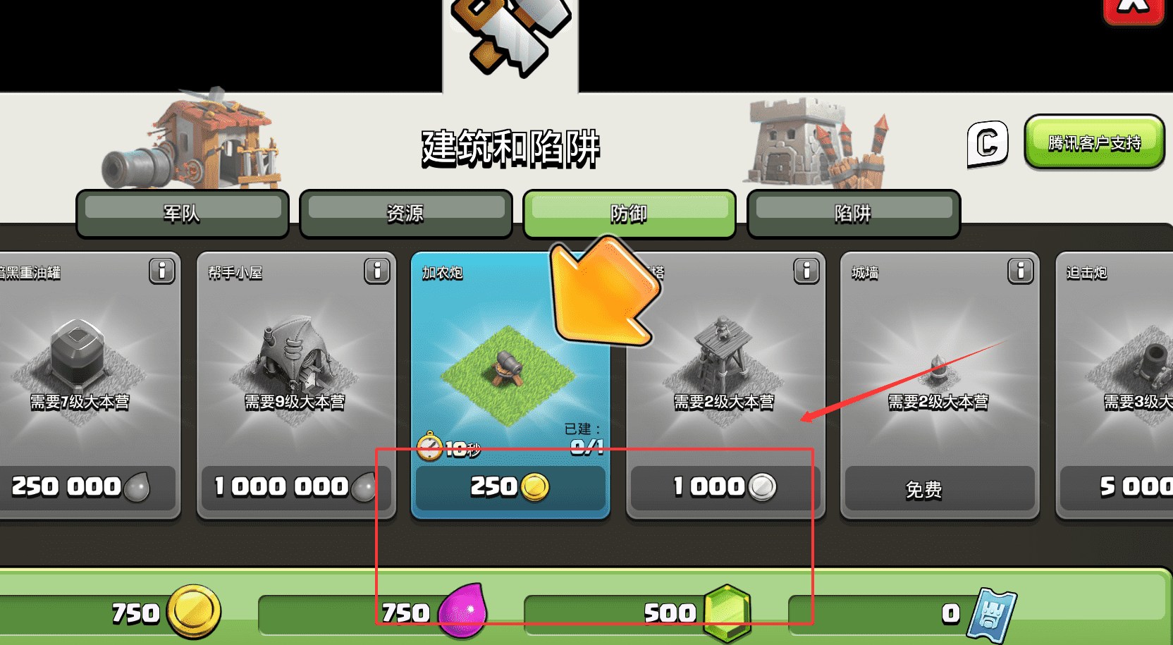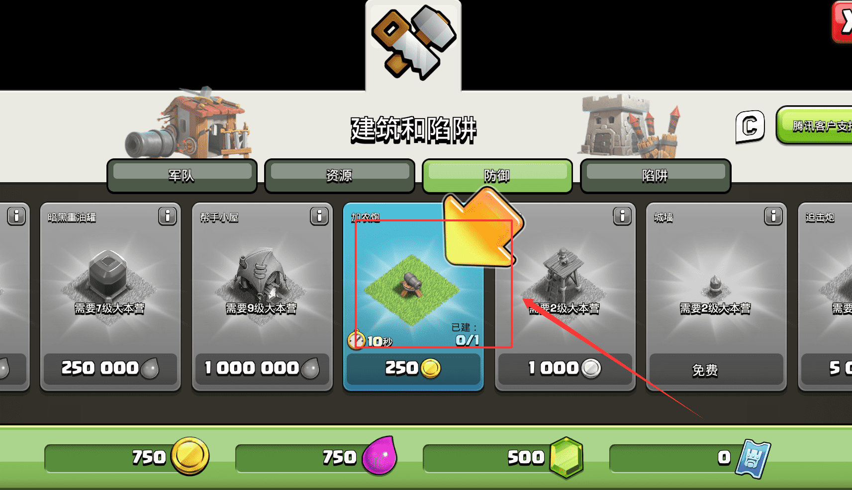 3、建造或升级的操作很简单啦,就像第三张图展示的那样,选中像“加农炮”或“超击炮”这样的项目。