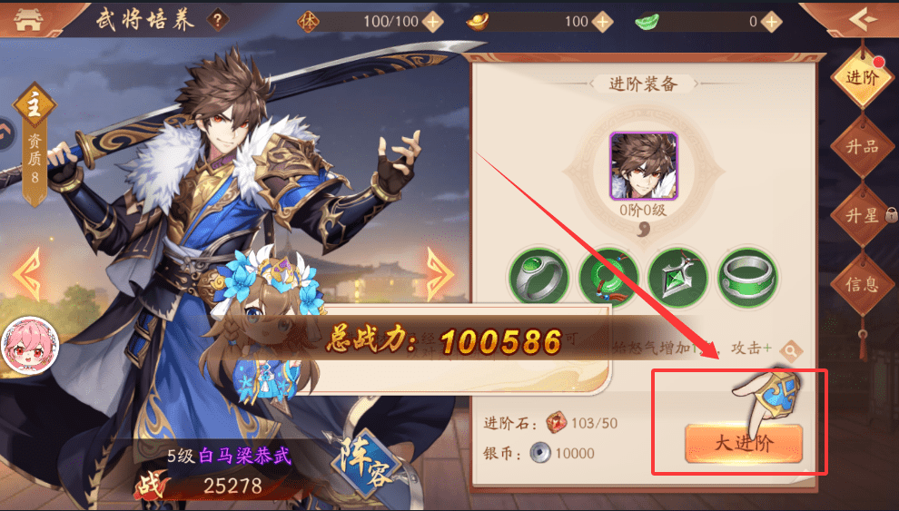 2、优先使用“进阶石”和“银币”给主力武将“进阶”,比如白马梁恭。每次进阶不仅能提升生命、攻击等属性,还能解锁更强的“天赋”,比如增加初始怒气。