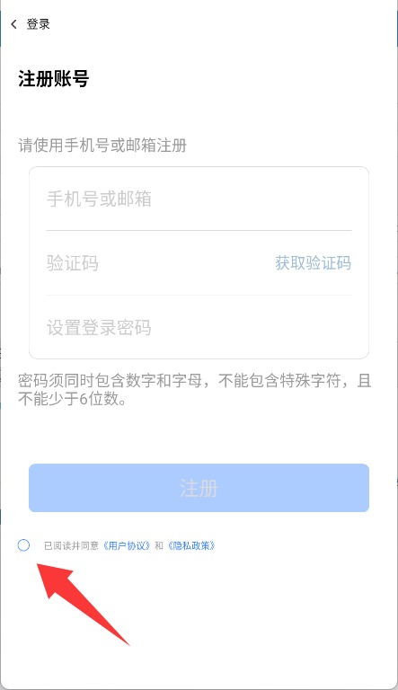 3、注册前需阅读并点击“同意”勾选用户服务协议,确认相关使用条款。
