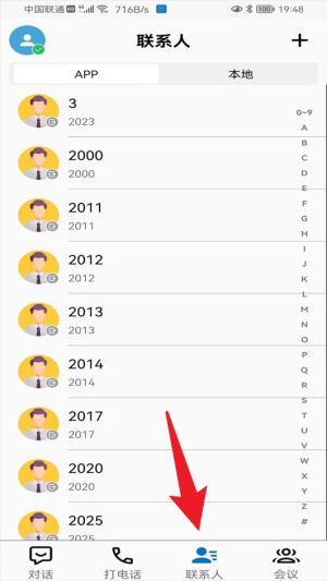 2、打开App首页后,点击底部“联系人”标签,即可浏览全部联系人及分类,方便快速查找并联系。