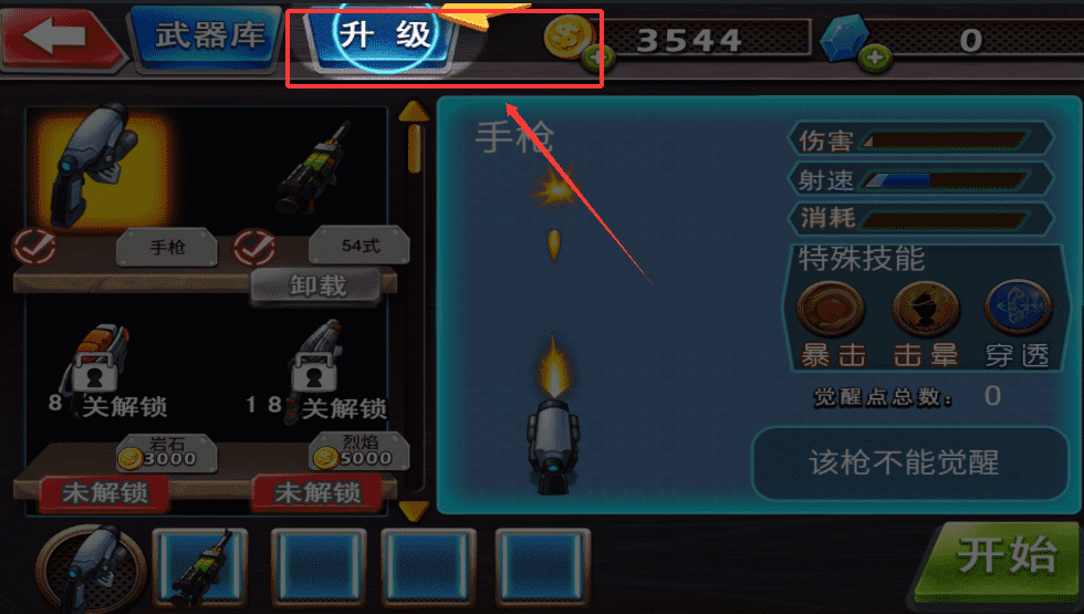 2、特殊技能如“暴击击晕穿透”很有用,但“觉醒点总数”显示为0,表示觉醒功能尚未开放。优先用手头金币升级基础属性,再逐步解锁新武器。