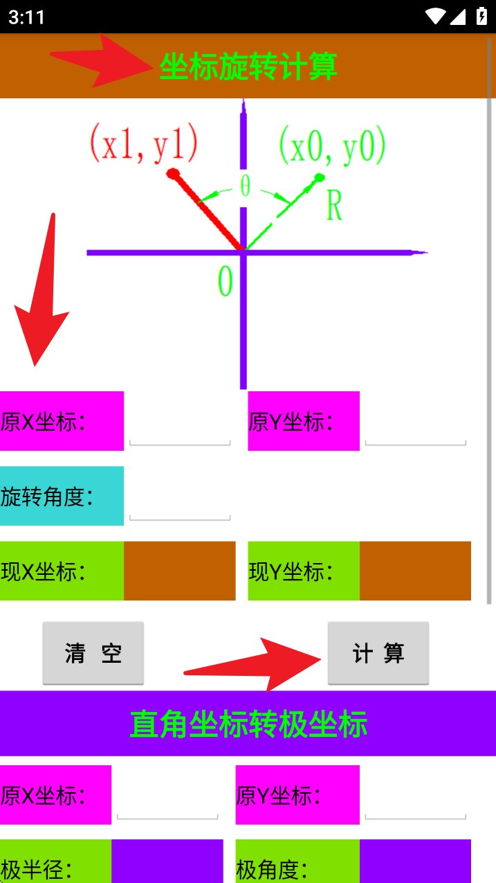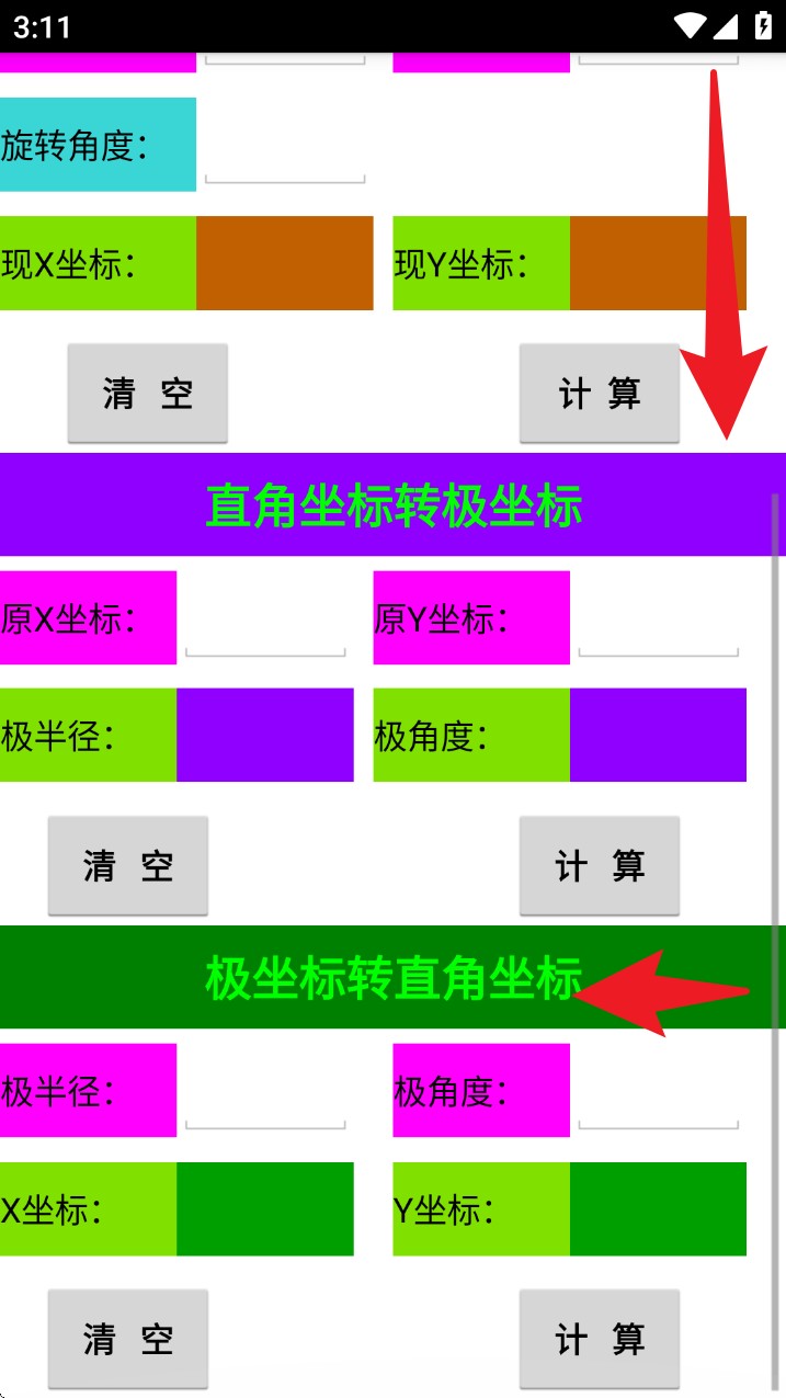 4. 页面下拉后进入「直角坐标转极坐标」与「极坐标转直角坐标」的计算区域,分别输入对应数值后点击计算即可查看结果。