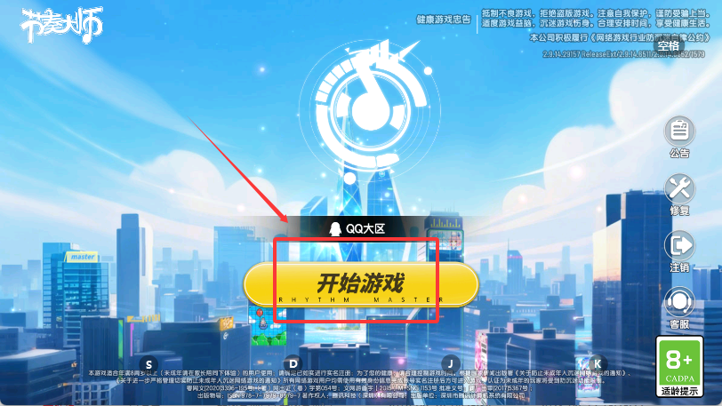 1、打开游戏首先来到登录页。页面顶部有健康游戏提示,中央是显眼的“开始游戏”按钮。