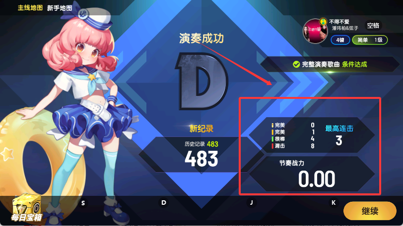 2、进入游戏后,核心玩法是节奏按键。界面上方会显示当前得分,比如483分,以及一首歌的剩余时间。多练习几次就能熟悉了。