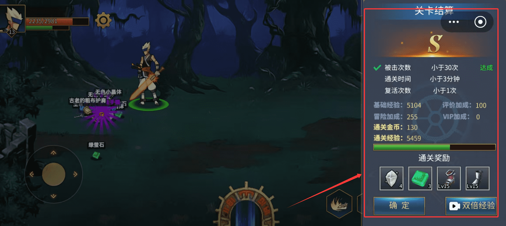 1、基础经验5104加上评价,冒险等加成,最终可获得5459经验,记得在通关后点击双倍经验按钮,能加速升级呢。