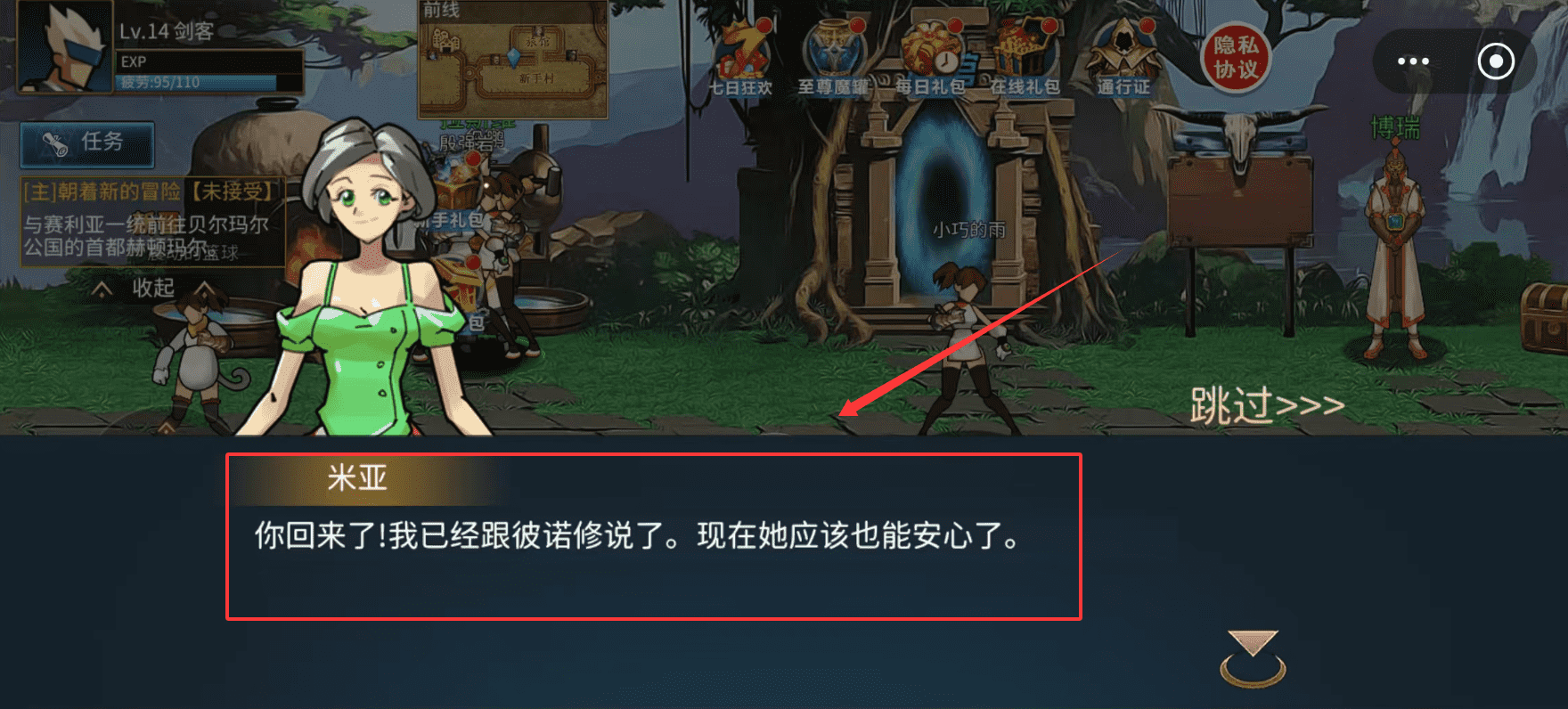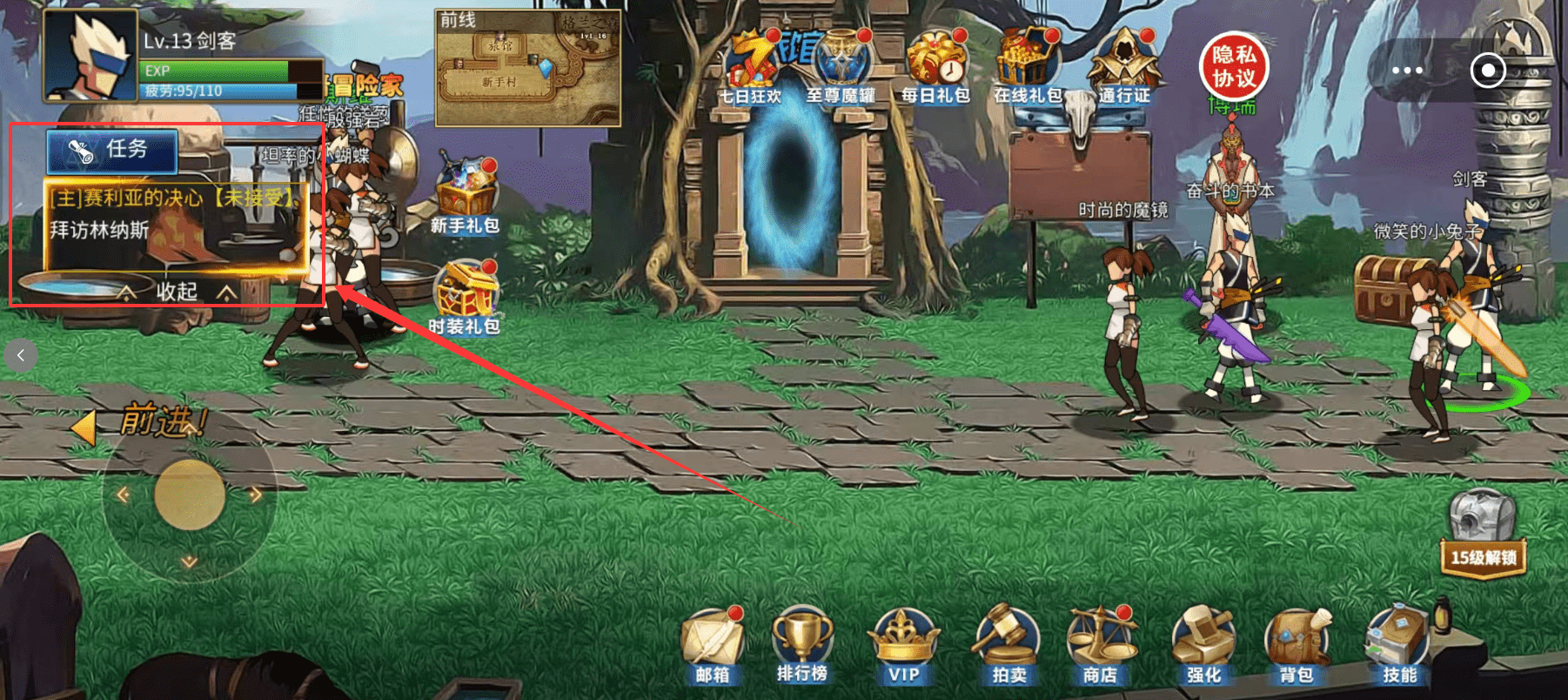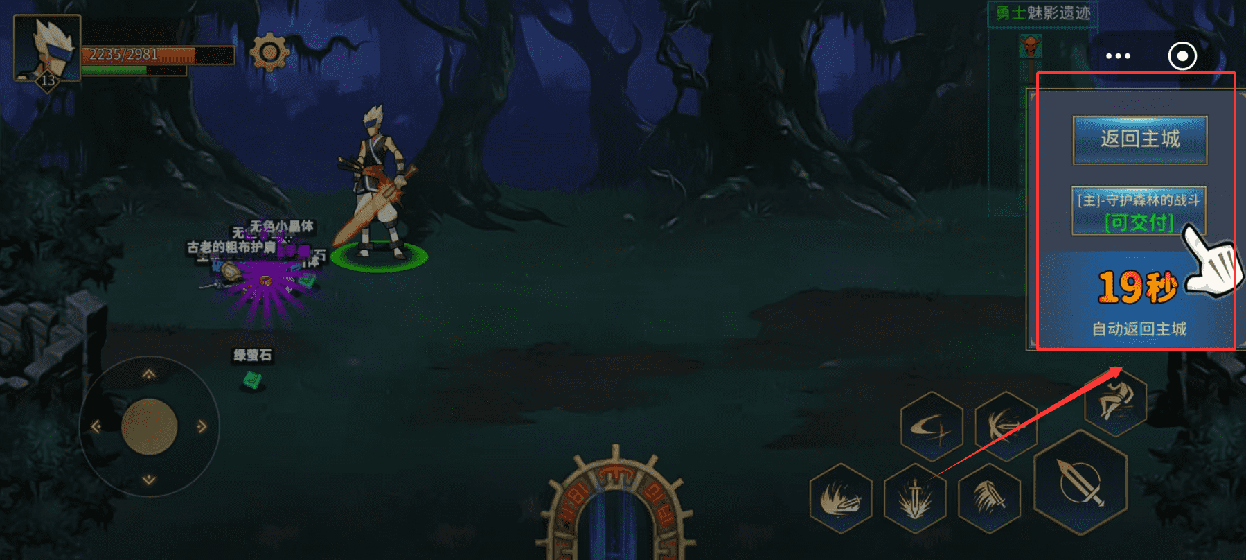 2、自动回到主城后就能接取新任务,比如守护森林的战斗,跟着任务指引走就行。