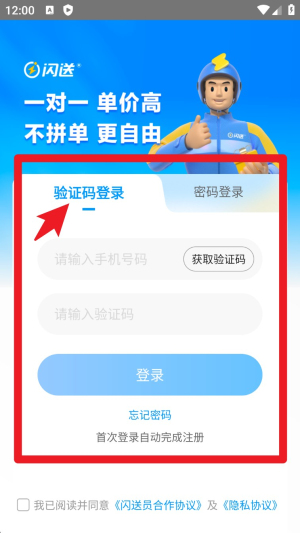 1. 打开 App 进入登录页,默认是验证码登录模式,输入手机号并点击获取验证码后完成登录。