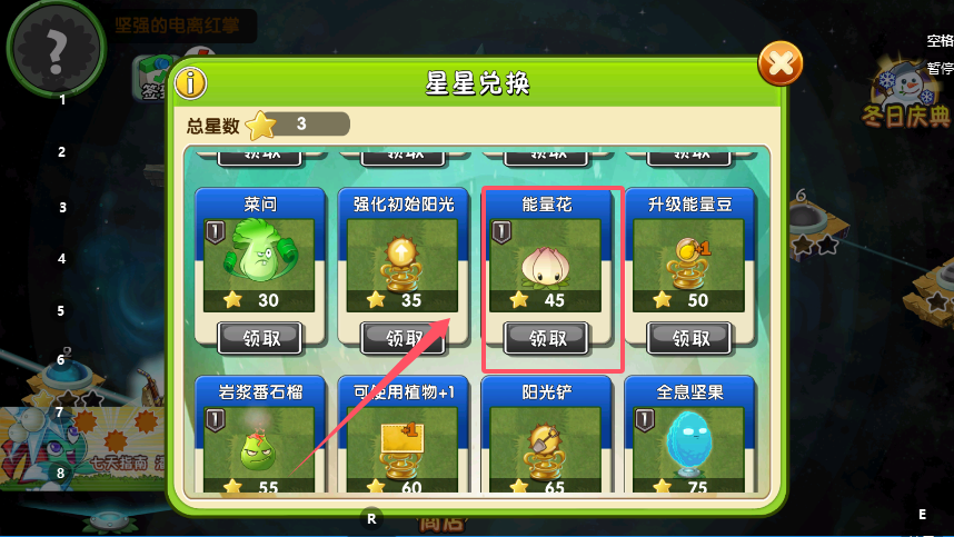 2、在星星兑换页面,查看总星数与各道具的星星消耗,比如“向日葵”需要5颗星星,星数达标的情况下,点击道具下方的“领取”按钮,即可获得对应的植物道具。