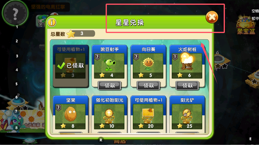 2、在星星兑换界面,查看总星数和每个道具的星星要求,例如“豌豆射手”需要4颗星星,当星数满足时,点击道具下方的“领取”键,就能拿到对应的植物或功能道具。