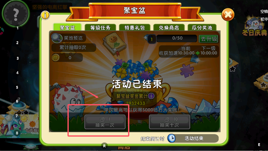 2、在聚宝盆主界面,选择单次或十次抽奖,每次抽奖都会累计次数,这些次数是提升瓜分奖池排名的关键,同时聚宝盆等级可通过成长值升级,等级提升后奖励收获速度加快。