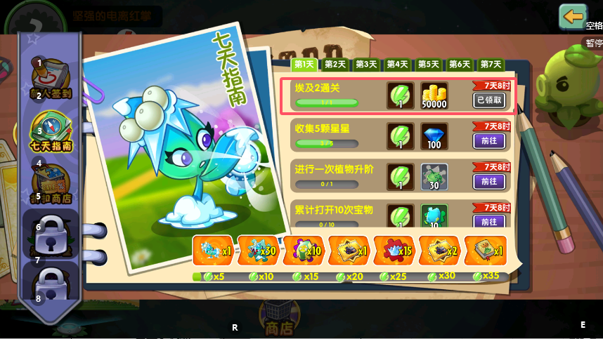 2、第二天转为收集模式需要获取五颗关卡星星,这个设计引导玩家关注关卡挑战目标,同时领取的三十钻石可用于超值商店首轮兑换,开始构建自己的特色植物阵容。