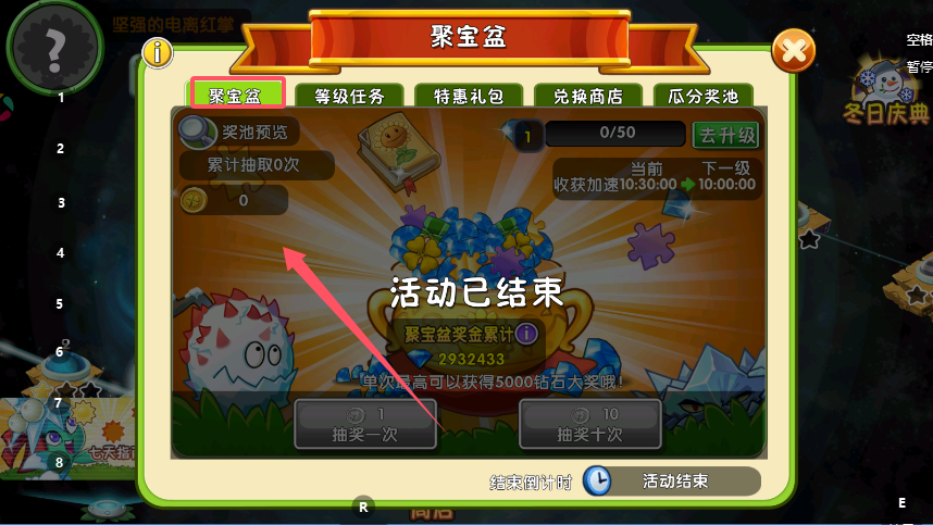 2、在聚宝盆抽奖页面,点击“抽奖一次”或“抽奖十次”积累次数,这些次数会关联瓜分奖池的排名,抽奖过程中可能触发单次5000钻石的大奖,奖池累计金额会实时更新。
