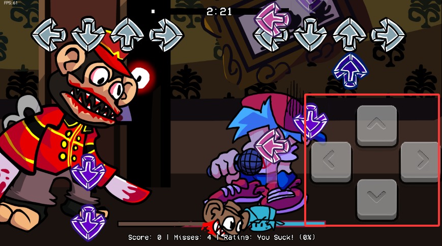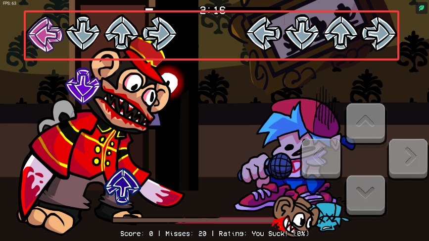 3、根据屏幕上方下落的箭头提示符号,使用右下角方向键进行精准按键演奏操作。
