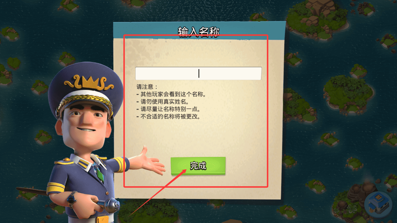 1、完成游戏协议的阅读与同意后,下一步是创建指挥官身份。在名称输入界面,需遵循提示设定一个得体的虚拟名称,该名称将在全服可见,用于识别你的基地与部队。