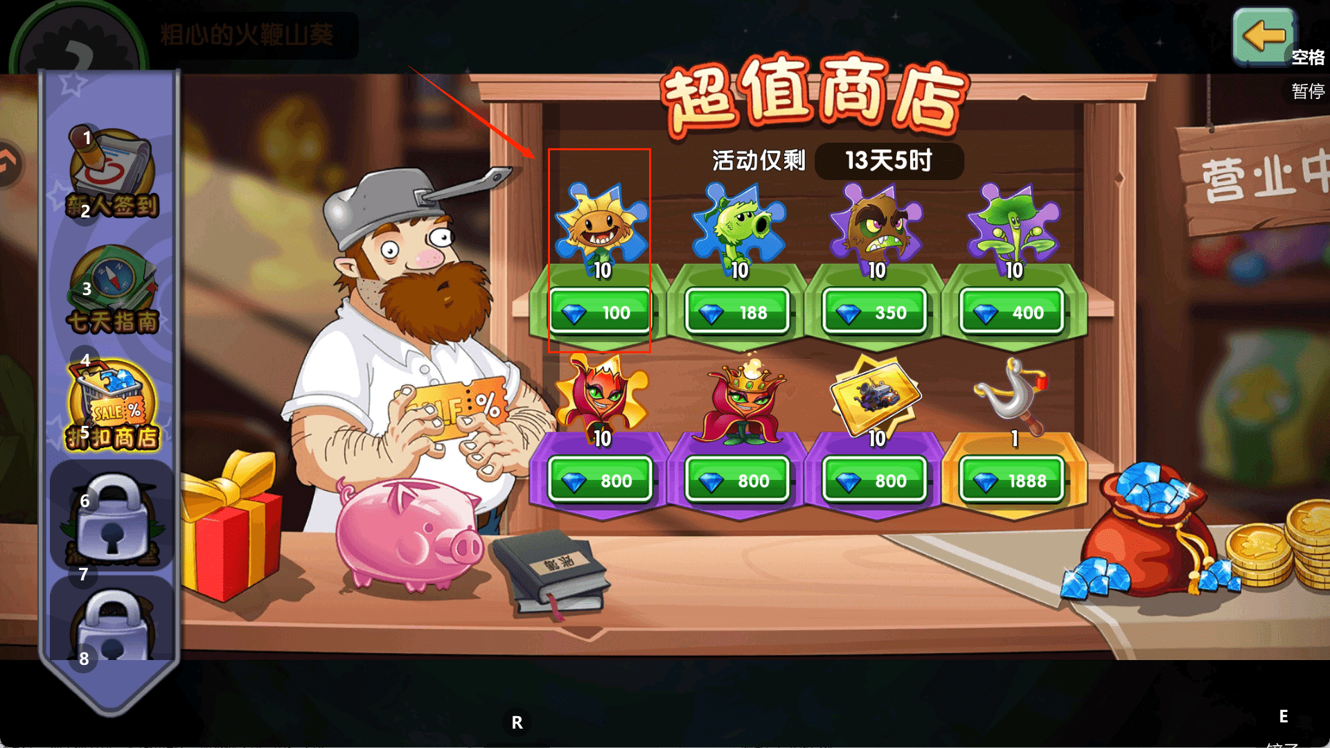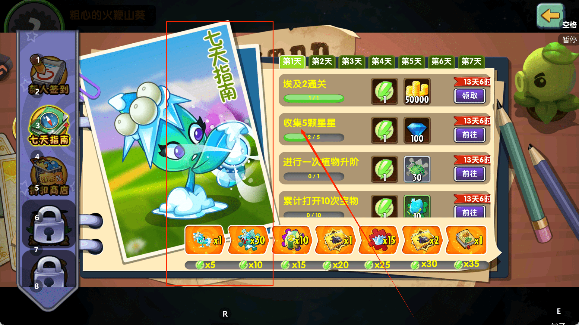 2、先完成“新人签到”熟悉游戏哦,每天登录领取奖励,同时了解各种道具和植物的用途。