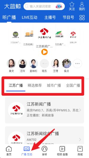 2、进入“广播·互动”栏目,可选择江苏广播、城市广播及全国广播等频道进行收听与互动。