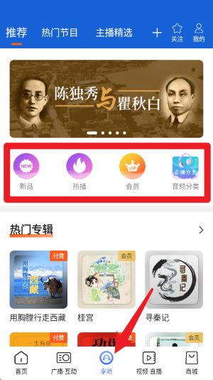 3、在“享听”界面中,可按新品、热播、会员及音频分类筛选内容,方便快速找到想听的节目。