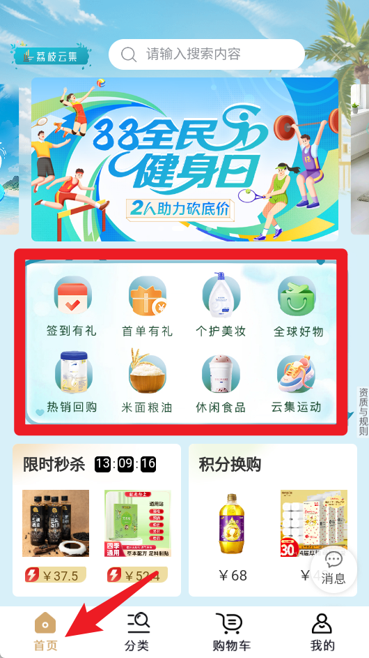 5、进入商城页面后,可在顶部分类区选择签到有礼、首单有礼、个护美妆、全球好物等板块,点击对应图标即可进入相关商品专区进行选购。