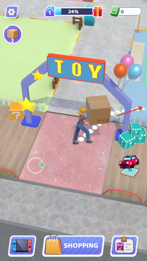 1、操控角色在场地中搬运散落的纸箱,将其集中收集,积累初始资源为后续店铺建设与布局调整奠定基础条件。